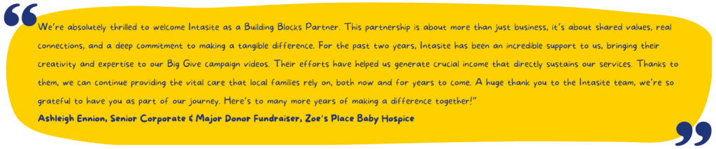 Intasite, a fast-growing UK-based digital health and safety software company, partners with organisations worldwide to improve safety, compliance, and efficiency across high-risk and secure sites. By becoming a Building Blocks Partner, Intasite is demonstrating their long-term commitment to social responsibility and community impact, aligning its mission of protecting people with Zoe’s Place’s work of caring for society’s most vulnerable children.
