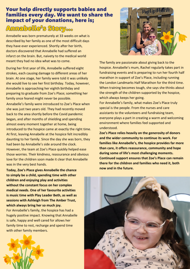 Annabelle’s story is a powerful example of your impact, through Zoe’s Place, her and her family received compassionate support that brought relief, joy, and comfort during a challenging time. Please take a moment to read her story and, if you can, consider donating to help more families access the same care.
